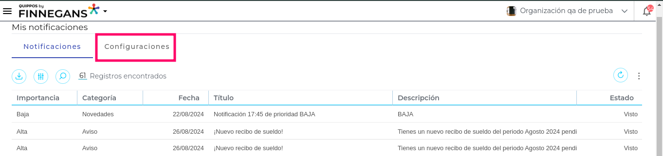 - Una vez en la grilla de “Mis notificaciones” dirigirse a la ventana “configuraciones”