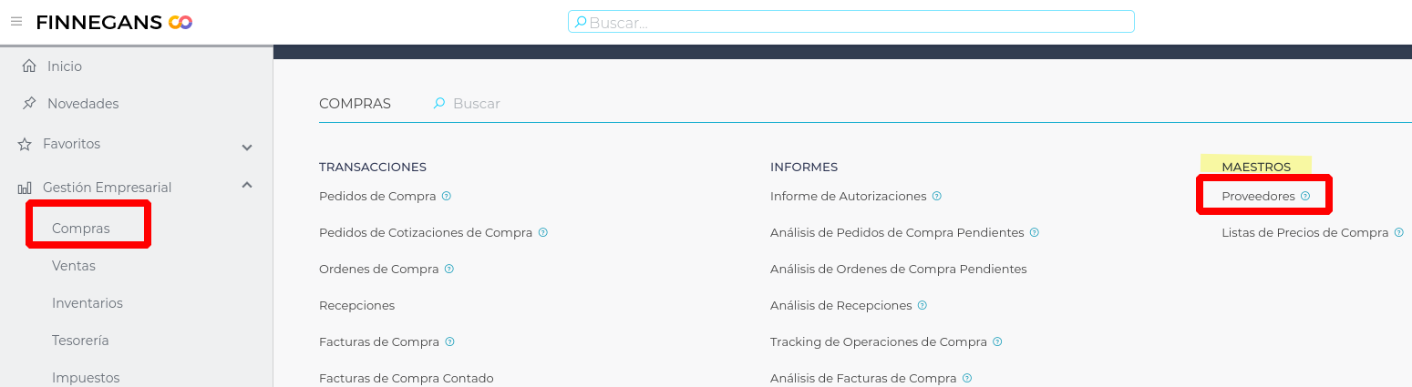 - Menú → Gestión Empresarial → Compras → Maestros → Proveedores