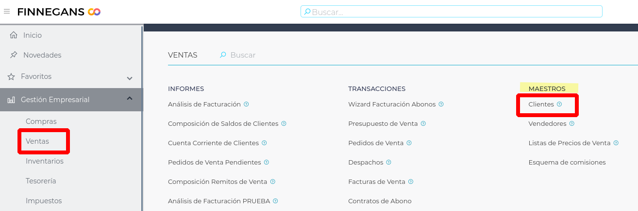 - Ir al Menú → Gestión Empresarial → Ventas → Maestros → Clientes