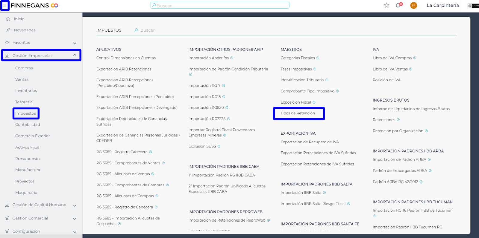 - Acceder desde el menú → Gestión empresarial → Impuestos → En la columna de maestros ingresar a Tipos de Retención.