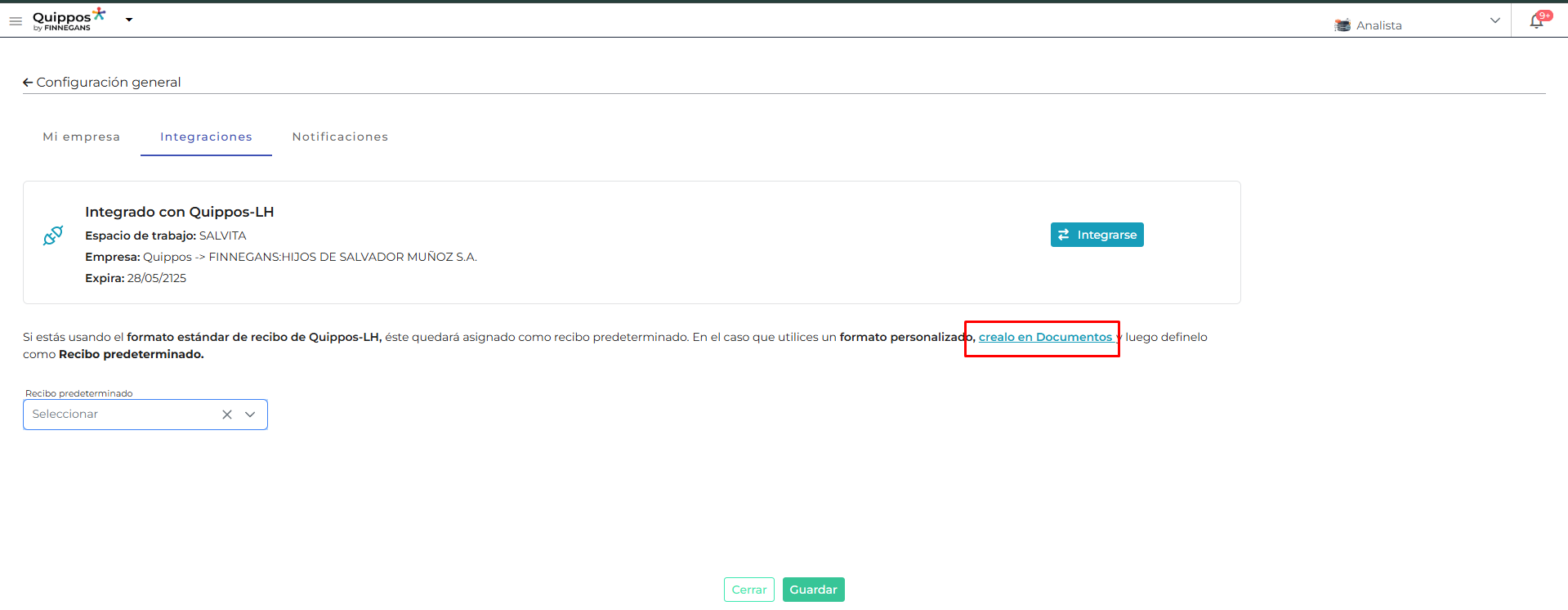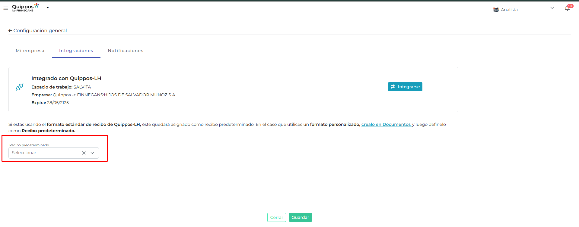 Ubicamos el campo “Recibo predeterminado” que solo estará visible si la integración de LH está activa.