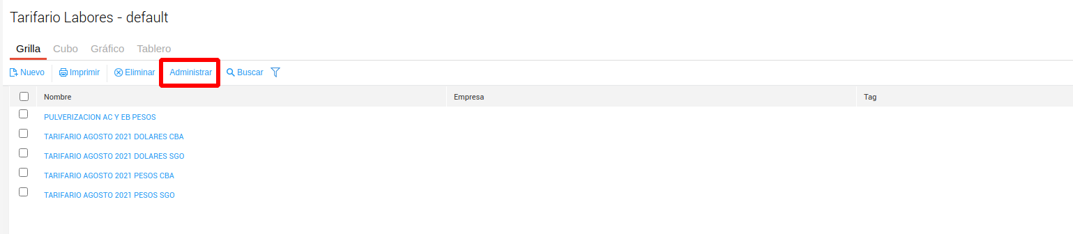 Ir a Agricultura - Gestión - Tarifario Labores y presionar en “Administrar”