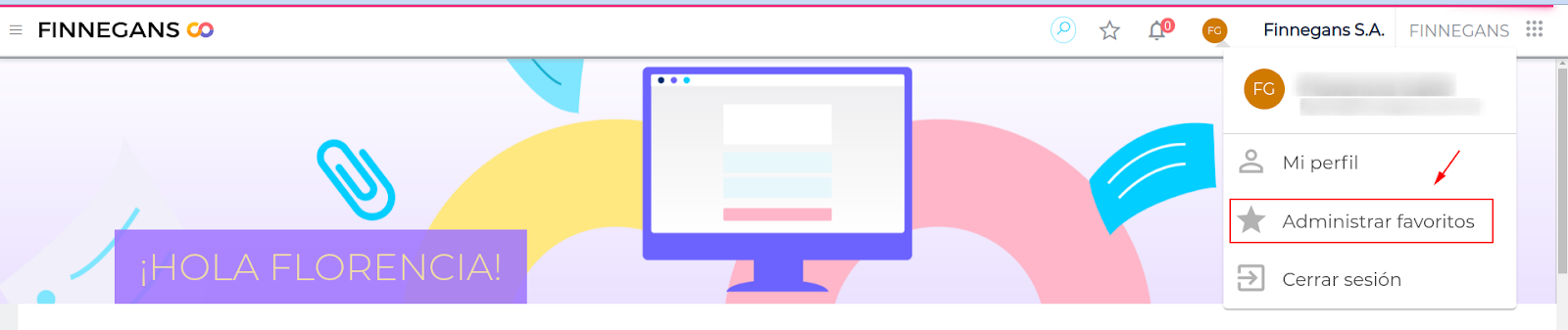 1- Hacer clic en las iniciales del usuario e ingresar en Administrar favoritos