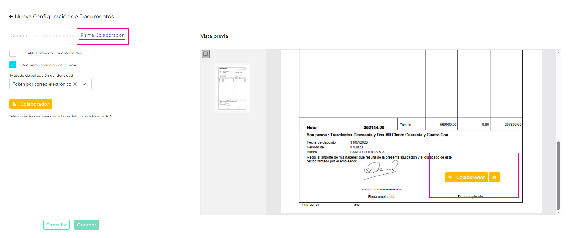 Se podrá configurar la ubicación de la firma del colaborador, y además se podrán definir las siguientes opciones: