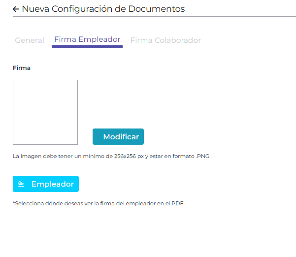 - Check Requiere la firma del Empleador: Al activar esta opción, se habilita la solapa “Firma del empleador”, desde donde se podrá subir la imagen de la firma (formato PNG, mínimo 256x256 px) y definir su ubicación dentro del PDF.