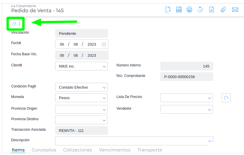 Ingresar a una transacción o maestro, y hacer click en el icono de “etiqueta”