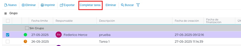 Para completar una tarea debemos seleccionarla y hacer click sobre “Completar tarea”