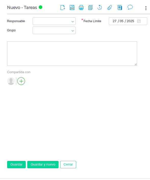 Completar información de la tarea: Responsable, fecha limite, grupo, descripción. En caso de no seleccionar un responsable, cualquier miembro del espacio de trabajo podrá completar la tarea