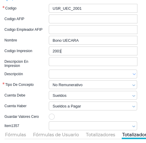- Código: Completar con USR para indicar que es de usuario. También podemos indicar el convenio, por ejemplo, USR_UEC_0001