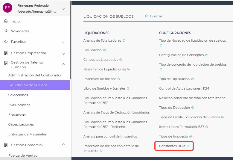 1-. Ingresar en Menú > Gestion de capital humano > Liquidación de Sueldos > Configuraciones > Constantes HCM > Nuevo.