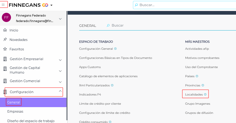 - Acceder al maestro de localidades: