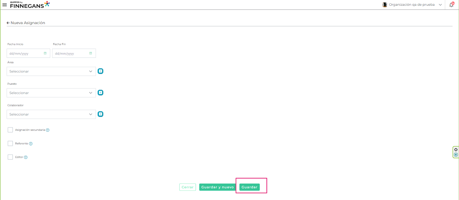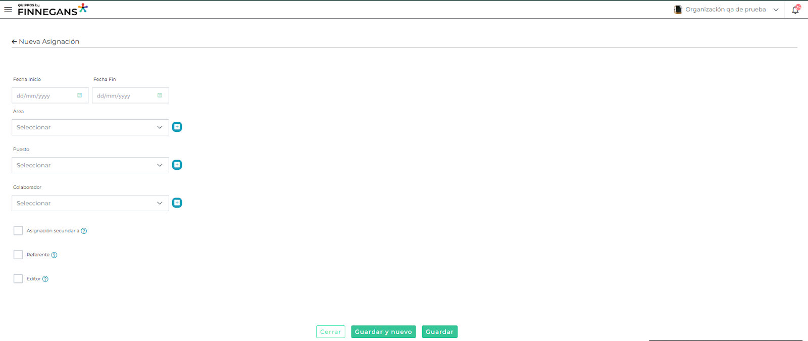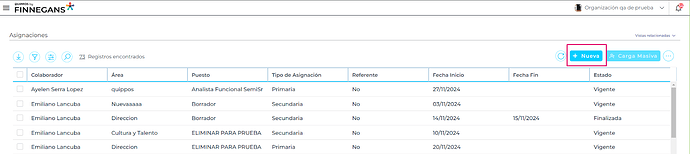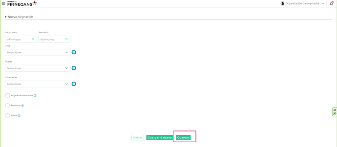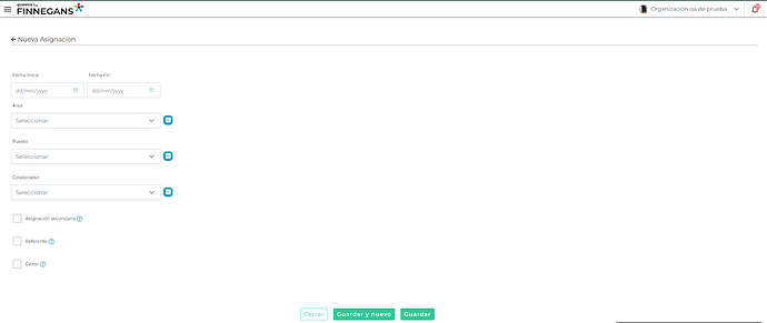 - Flexibilidad en el registro: Si es necesario, puedes dar de alta un colaborador, área o puesto directamente desde el formulario de asignaciones. El sistema redireccionará al formulario correspondiente, completando automáticamente el campo en asignaciones al finalizar.