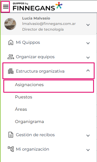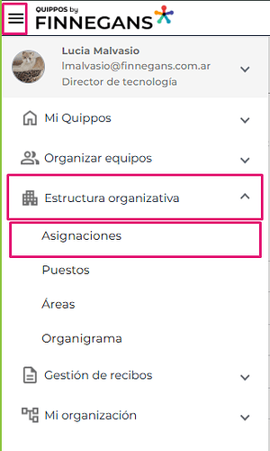 Menú hamburguesa → Estructura Organizativa → Asignaciones.