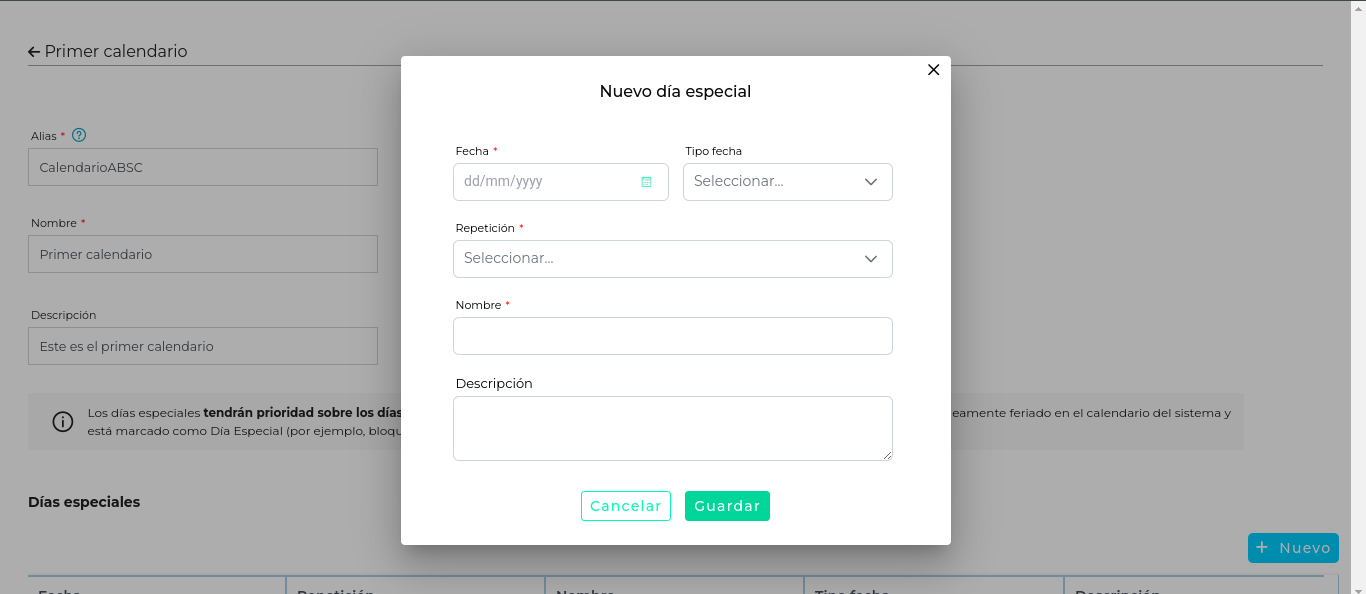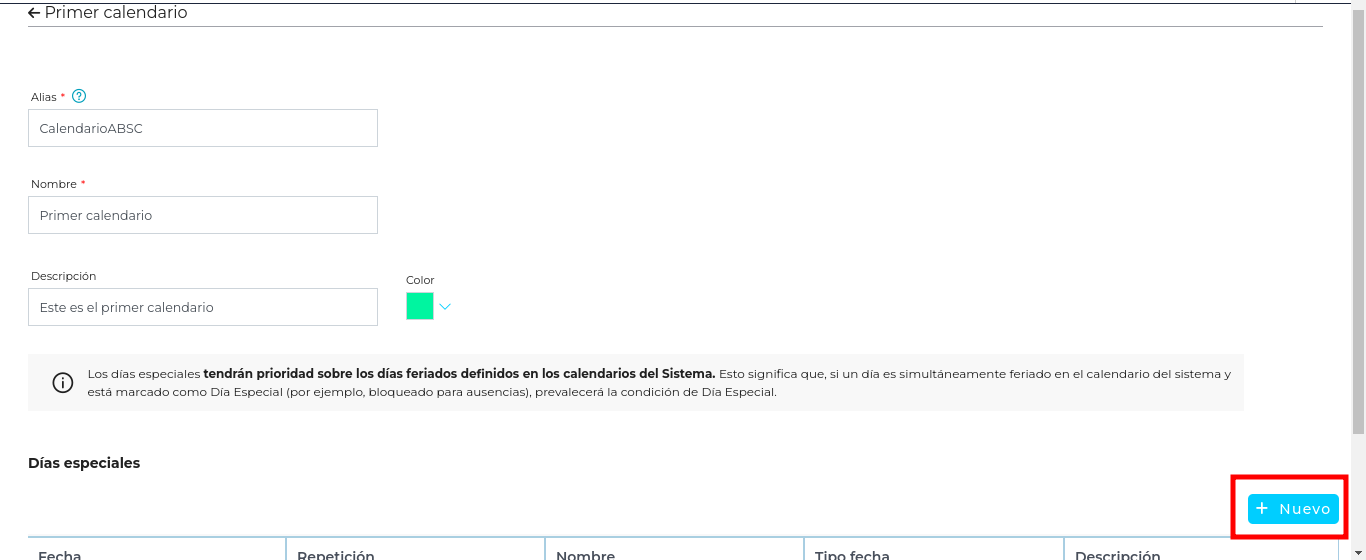 - Tipo de fecha: opciones configurables, como “No laboral/feriado” o “Bloqueado para ausencias”, que determinan el tipo de día especial.