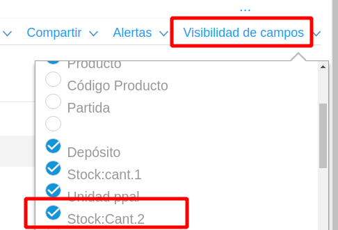 - Buscar en el reporte “Resumen de stock por Depósito” dicho producto marcando en visibilidad de campos la opción “Stock: Cant 2”