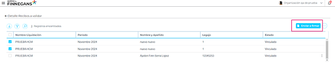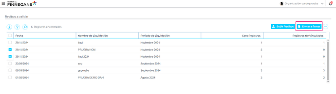 - Una vez que se seleccione la/s liquidacion/es correspondientes se debe presionar el botón “Enviar a firmar”.