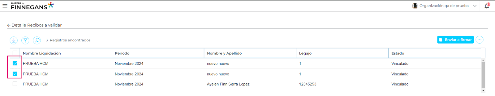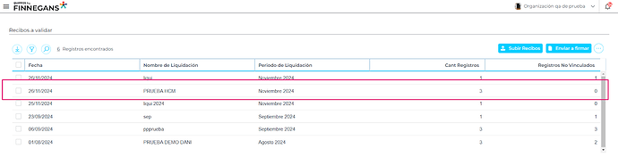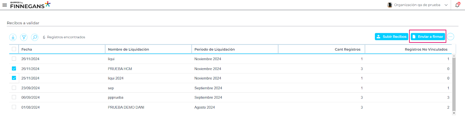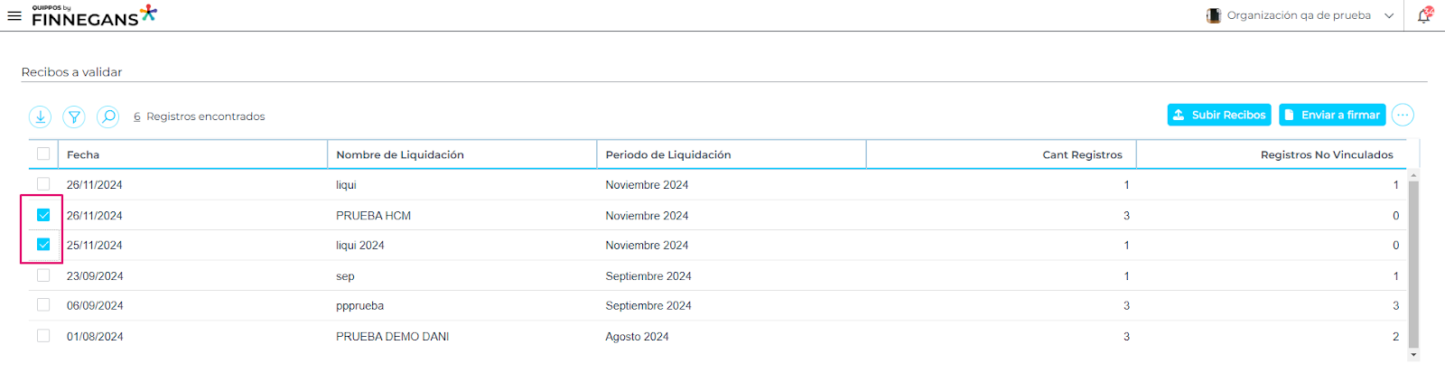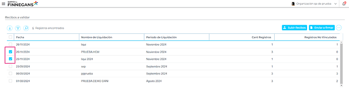 - Para enviar a firmar una liquidación se debe seleccionar la liquidación desde los checkboxes que se ubican del lado izquierdo de cada uno de ellos. Se puede seleccionar una liquidación o varias.
