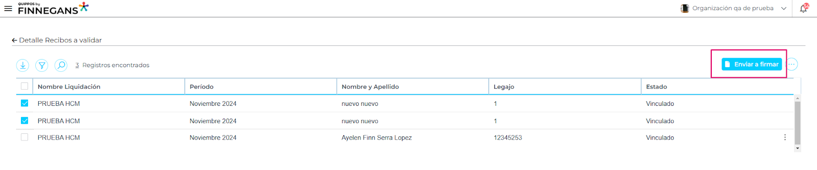 - Una vez que se ingresa a la liquidación se deberán seleccionar los recibos de sueldo que se enviarán a firmar, se podrán seleccionar desde los checkboxes que se ubican del lado izquierdo de cada uno de ellos.
