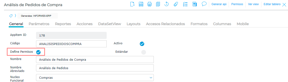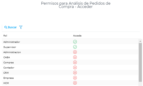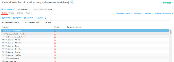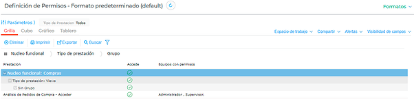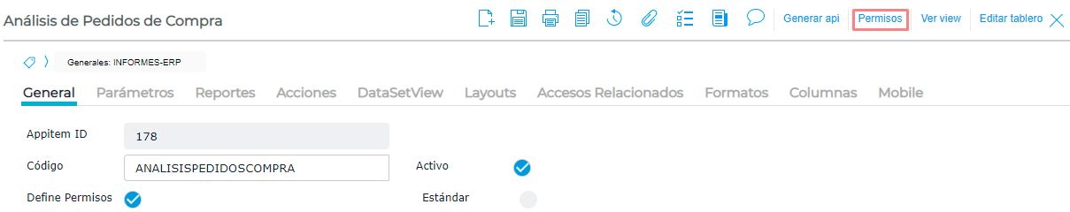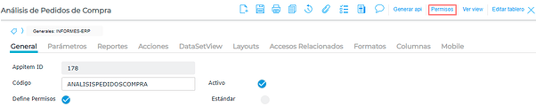 Cuando se presiona el botón Permisos el sistema abre una nueva pestaña en el navegador apuntando a la grilla de definición de permisos, en cuyos parámetros está establecida la prestación de la viewer desde la cual se accedió (en el caso del ejemplo, la prestación del tipo viewer para la visualización del informe Análisis de Pedidos de Compra).