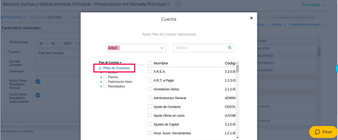 - Dentro de parametros ingresar en cuenta elegir “arbol” y tildar “plan de cuentas”. Luego aceptar