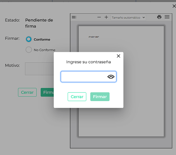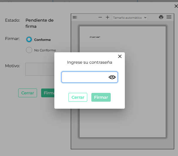 - Al ingresar se visualizará el pop up donde se deberá seleccionar si se firma como conforme o NO conforme, también se podrá visualizar el recibo de sueldo desde el mismo popup.