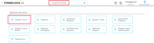 Para evitar estos caracteres, escribir la opción de menú que estamos buscando sin ese carácter especial. Por ejemplo, si queremos buscar “Proyecto - Ítems”, debemos buscarlo como “Proyecto Ítems”, de esta forma nos traerá el resultado esperado, habiendo escapado al carácter especial “-”.