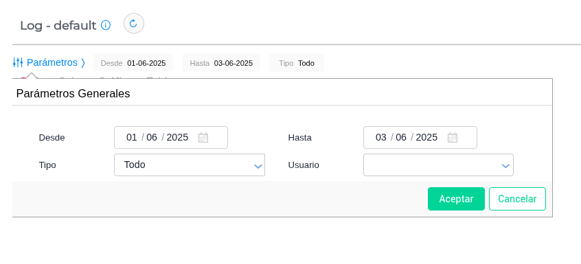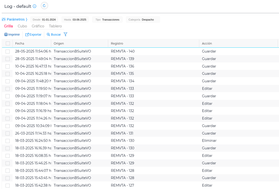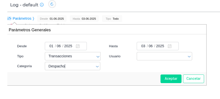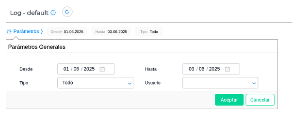 Cuenta con los parámetros que permiten buscar el historial de cambios por fechas desde y hasta, usuarios y tipo, pudiendo así filtrar por maestro, por transacción u otros eventos.
