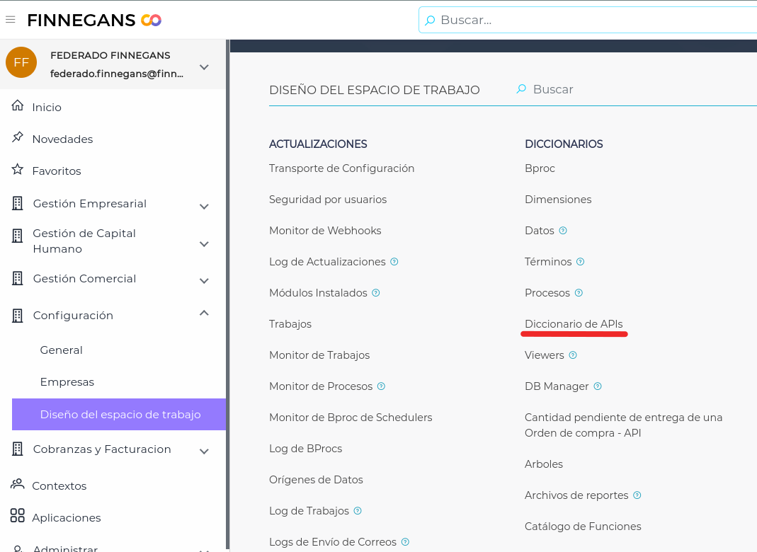 Configuración → Diseño del espacio de trabajo → Diccionarios → Diccionario de APIS.