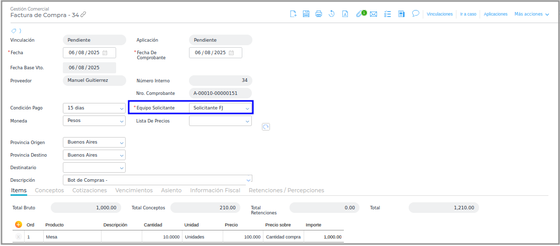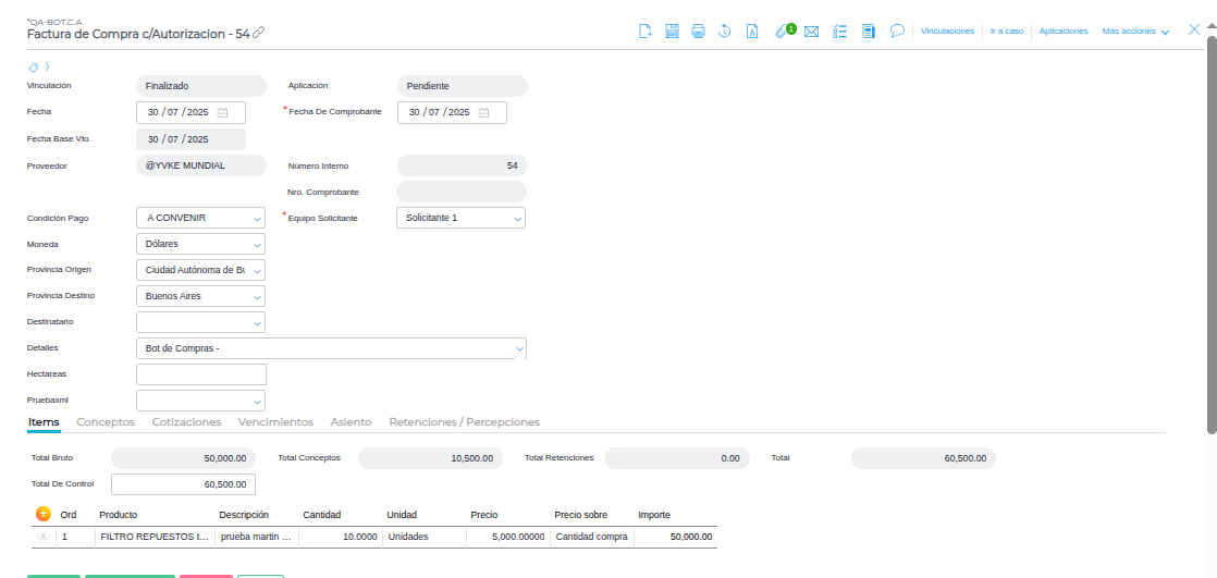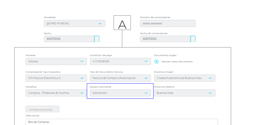 Desde el Bot de Compras se pueden generar Facturas de compras que tiene asociado el proceso de Reglas de Autorización en la actividad pendientes de Autorización. Teniendo en cuenta el equipo solicitante y si el usuario pertenece o no al equipo.