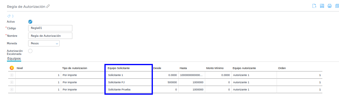 Ir a Menú → Configuraciones → Diseño de espacio de trabajo → Reglas de Autorización, dentro de Reglas de autorización tener configurado un equipo solicitante y equipo autorizante, en la sección de equipos con sus respectivos montos desde hasta.