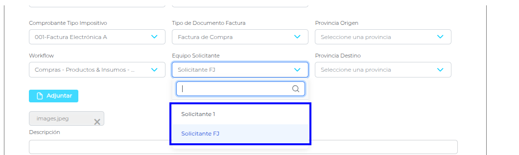 Caso 1 - Crear una factura con donde usuario pertenece a mas de un equipo solicitante.