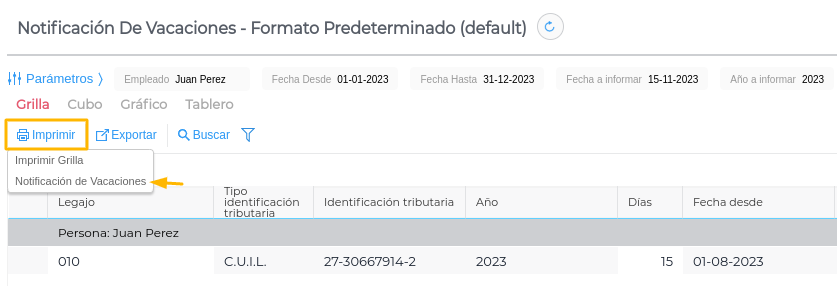 - Para imprimir la notificación, cliquear en Imprimir > Notificación de Vacaciones.