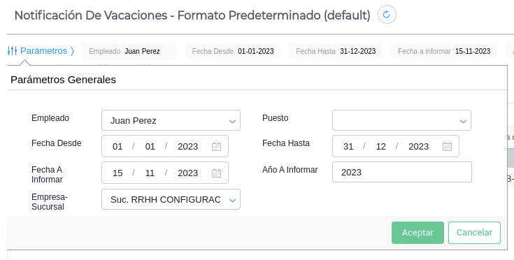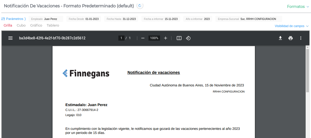 un reporte emitido por el sistema, en el cual se podrá visualizar la fecha de notificación y la empresa en la que desempeña el puesto la persona. Además quedarán plasmados los datos del empleado como ser el nombre, la identificación tributaria y el legajo.Con lo que respecta a los datos de las vacaciones se podrá visualizar el año al cual