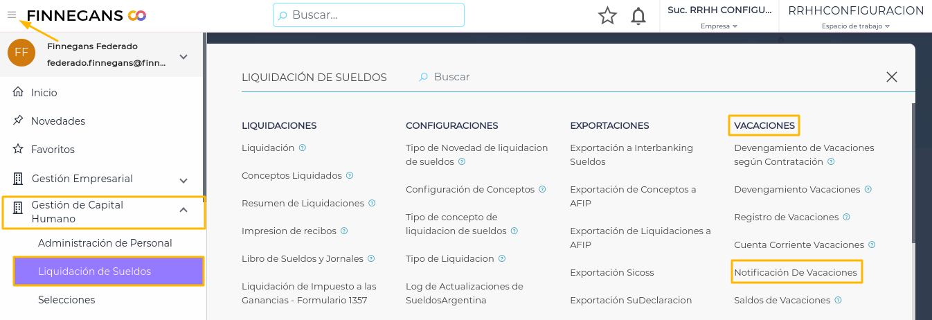 Ingresar al Menú > Gestión de Capital Humano > Liquidación de Sueldos > Vacaciones > Notificación De Vacaciones.