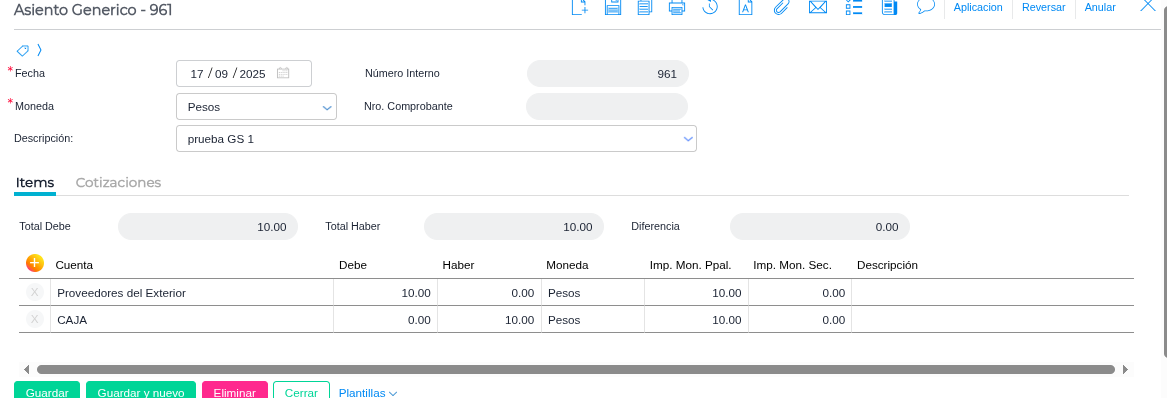 Completá al menos los campos obligatorios que te pide el Asiento genérico.