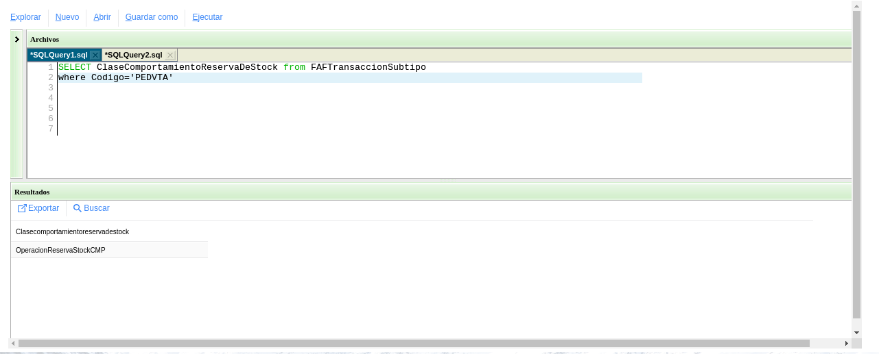 - Si se desea agregar la clase comportamiento de reservas de stock a un documento que no la tiene, ir a Menú → Configuración → Diseño del espacio de trabajo → DB Manager y colocar la siguiente query.