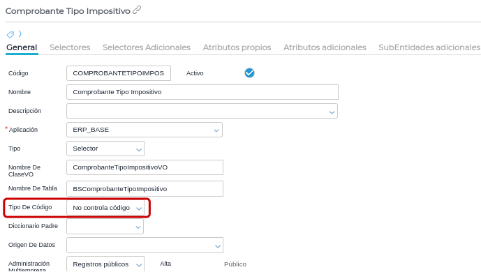 Para solucionar este problema, en caso de ser necesario, deberán dirigirse al Diccionario de Datos, y en “Comprobante Tipo Impositivo” configurar en el campo “Tipo de Código” la opción de “No controla código”: