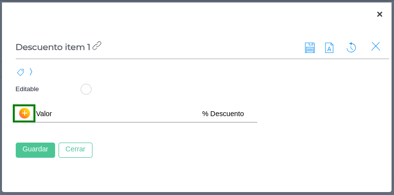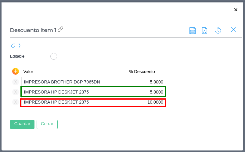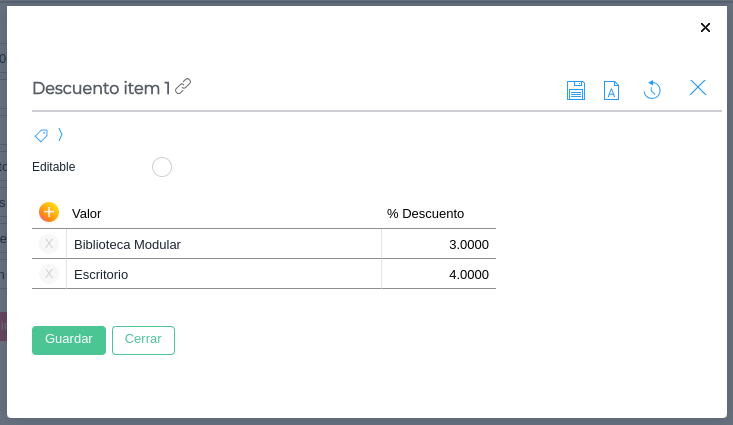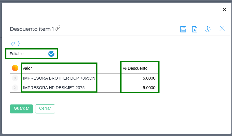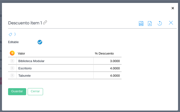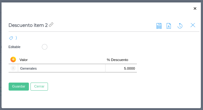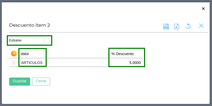 - Valor: muestra los valores del maestro seleccionado en el campo “Descuento por ítem 1”. Es posible configurar descuentos para múltiples ítems.