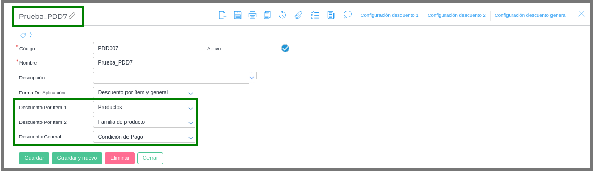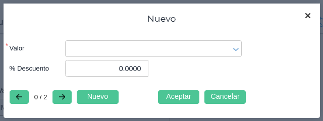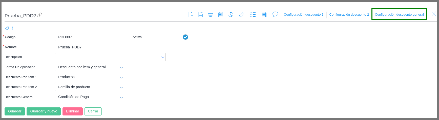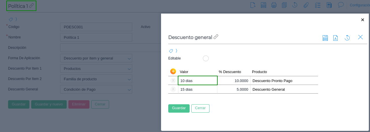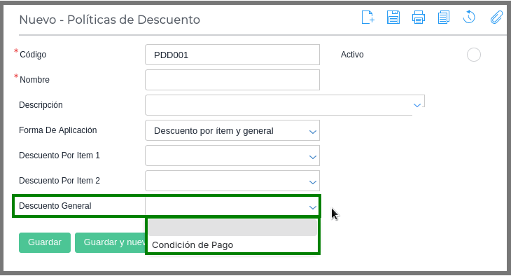 - Valor: muestra las opciones existentes en el maestro Condiciones de Pago, que es lo que se selecciona en el campo “Descuento General”. Es posible configurar descuentos para múltiples ítems.