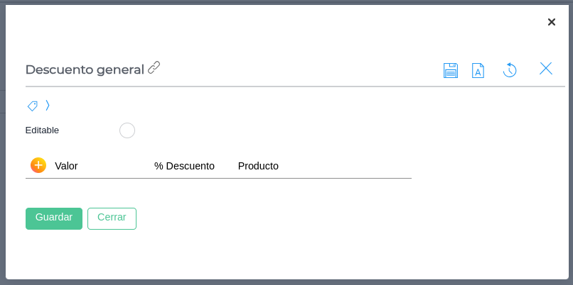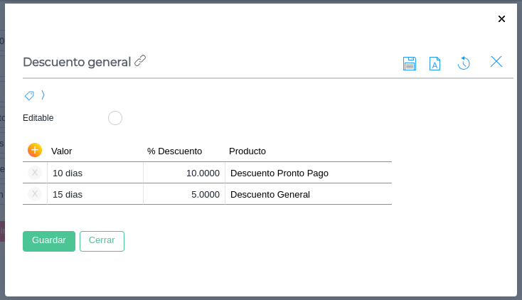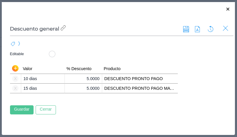 - Editable: por defecto está deshabilitado. Si se habilita, permite que en la operación el campo “% Desc. general” se puede modificar.