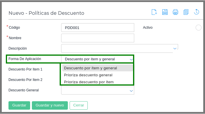 Forma de aplicación es el selector donde se define el criterio para aplicar los descuentos en una operación, permitiendo que se apliquen de manera prioritaria o simultánea. Por defecto, el sistema trae configurada la forma de aplicación “Descuento por ítem y general”.