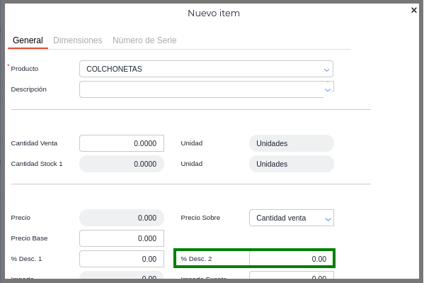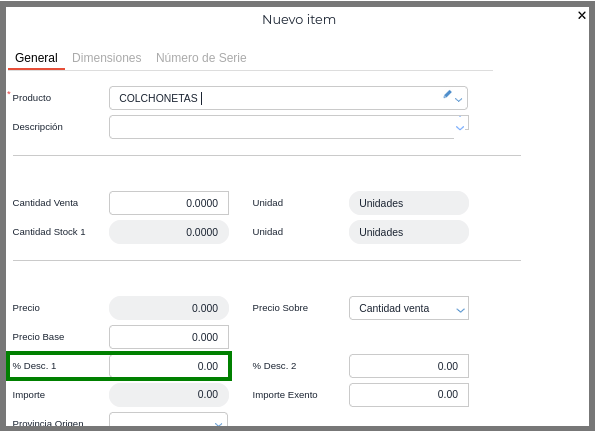 - % Descuento: será el valor de descuento elegido, el mismo debe estar entre 0 y 100. Este valor se visualiza a nivel cabecera en la operación, en el campo “% Desc. general”.