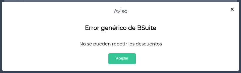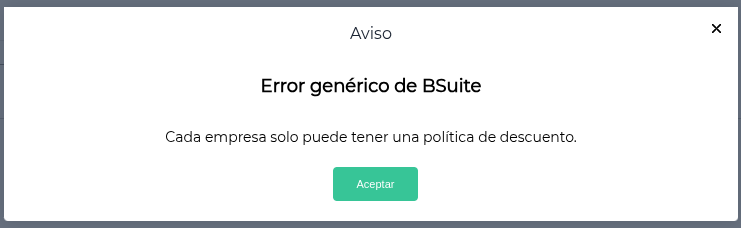 Importante: al asociar una Política de Descuento a un cliente, solo se puede configurar una por empresa, ya que no se permite asignar múltiples políticas de descuento a la misma empresa. Si se intenta aplicar dicha configuración, el sistema mostrará el siguiente mensaje: