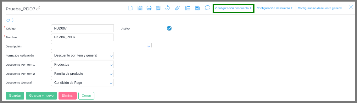 - Familia de producto: el descuento se aplicará al producto seleccionado, perteneciente al maestro de Familia de producto.