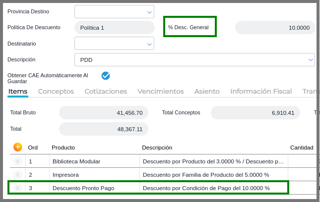 Importante: al priorizar por descuento general, aunque existan descuentos asignados a nivel ítem, solo se aplica el descuento general de manera global para toda la operación. Los descuentos específicos por ítem quedan excluidos. -