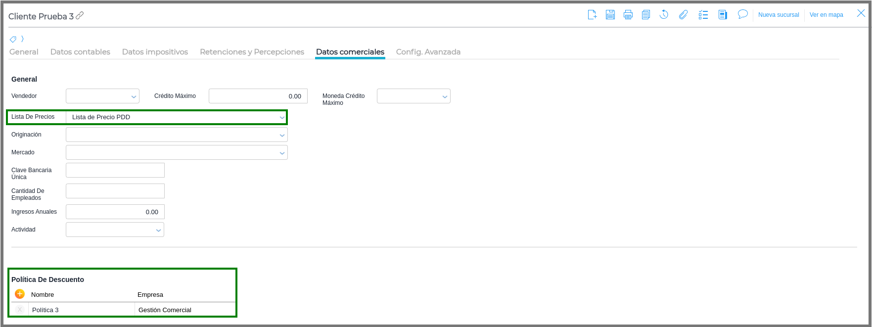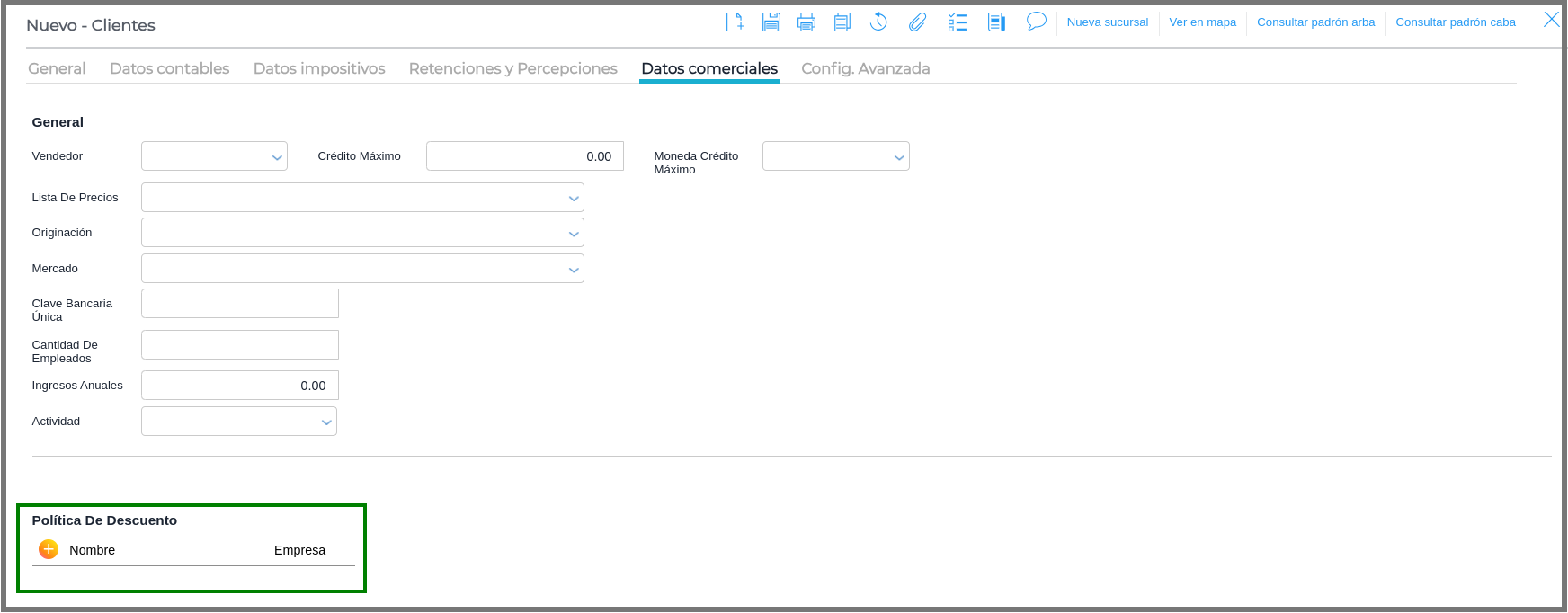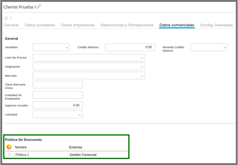 Para que se apliquen los criterios definidos en una Política de Descuento, esta debe estar asociada al cliente en la empresa donde se realiza la transacción.
