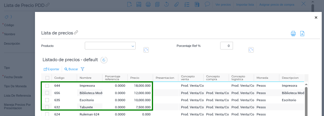 - Producto: muestra los valores del maestro Productos que tengan habilitada la casilla se selección “Se vende”.