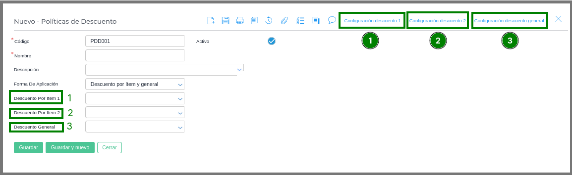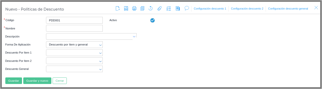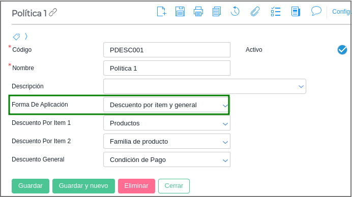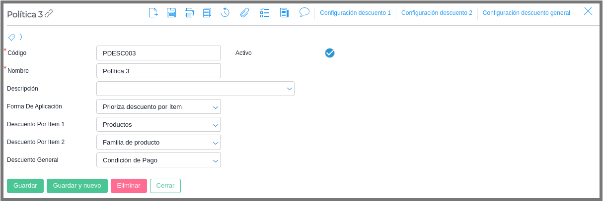 Al habilitarla, será posible utilizar la política de descuento que tenga asociada el cliente en la operación con los criterios que se definieron previamente.