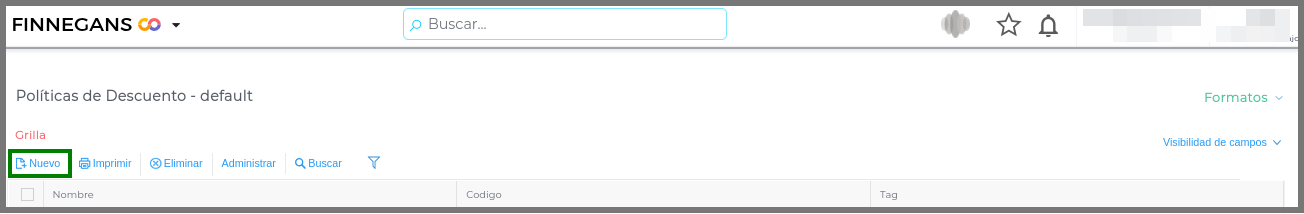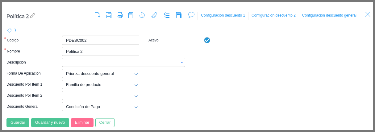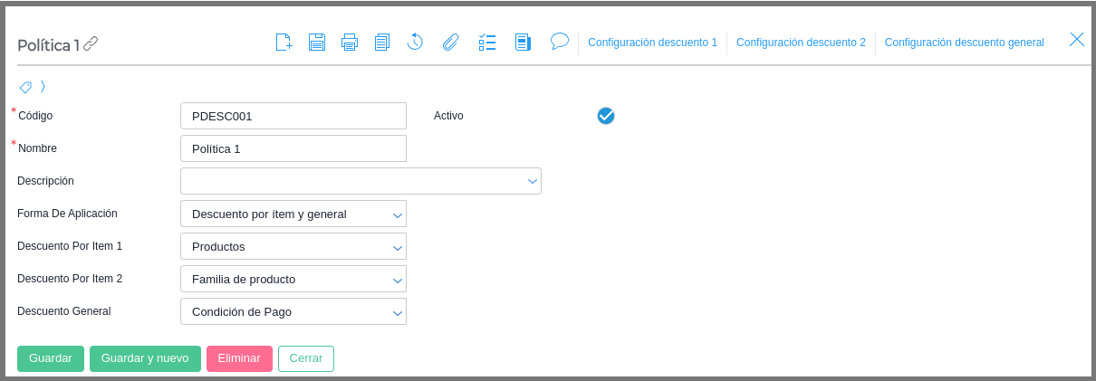 Una vez posicionados en el documento, en esta solapa se habilita el uso de Políticas de Descuento.
