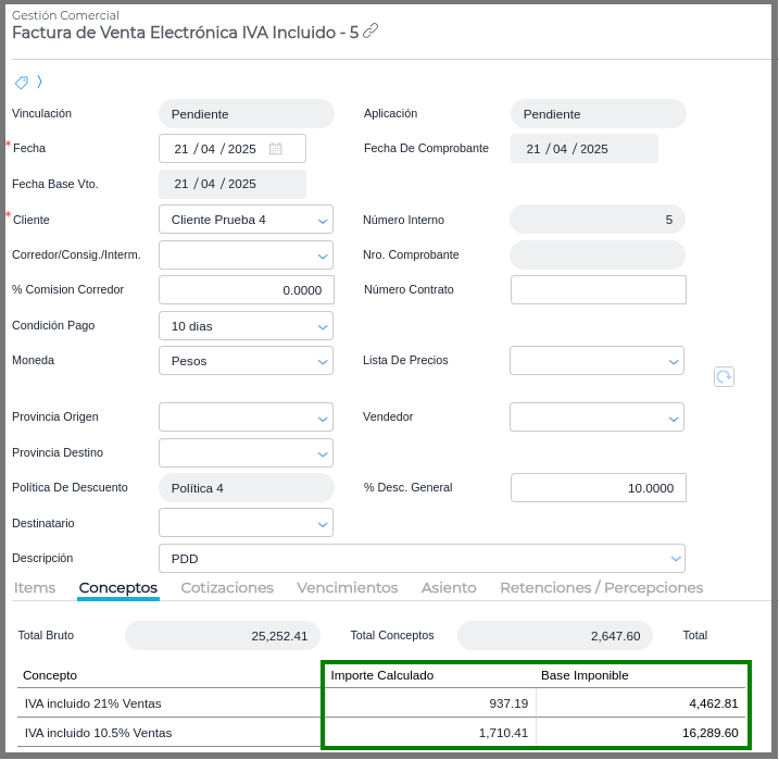 Cuando se aplica un descuento general en una operación de un documento con IVA incluido, ese descuento debe restarse del monto sobre el cual se calcula el IVA. Luego, con esa base ya ajustada, se visualiza en la solapa “Conceptos” la base imponible correspondiente y el IVA desagregado.